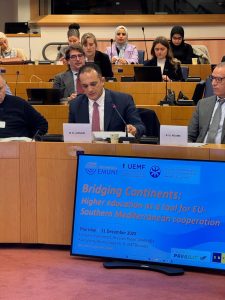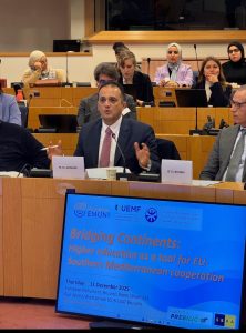 Prof. Dr. Mohamed El Shinawi, President of Galala University, participated in the high-level international conference “Bridging Continents: Higher Education as a Tool for EU–Southern Mediterranean Cooperation”, held at the European Parliament in Brussels. The conference convened senior policymakers, university leaders, and higher education experts to examine how academic cooperation can contribute to sustainable development, stability, and integration across the Euro-Mediterranean region.